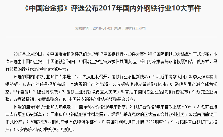2018年1月3日,工業(yè)和信息化部在官網(wǎng)上刊出《<中國冶金報(bào)>評選公布2017年國內(nèi)外鋼鐵行業(yè)10大事件》一文,對《中國冶金報(bào)》評選的2017年“中國鋼鐵行業(yè)10件大事”和“國際鋼鐵10大熱點(diǎn)”進(jìn)行了介紹。